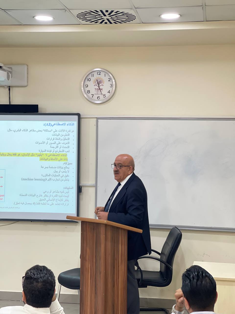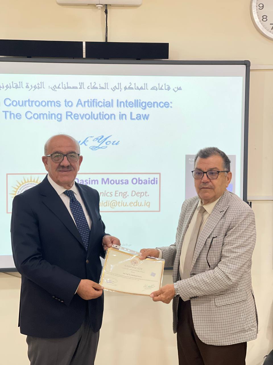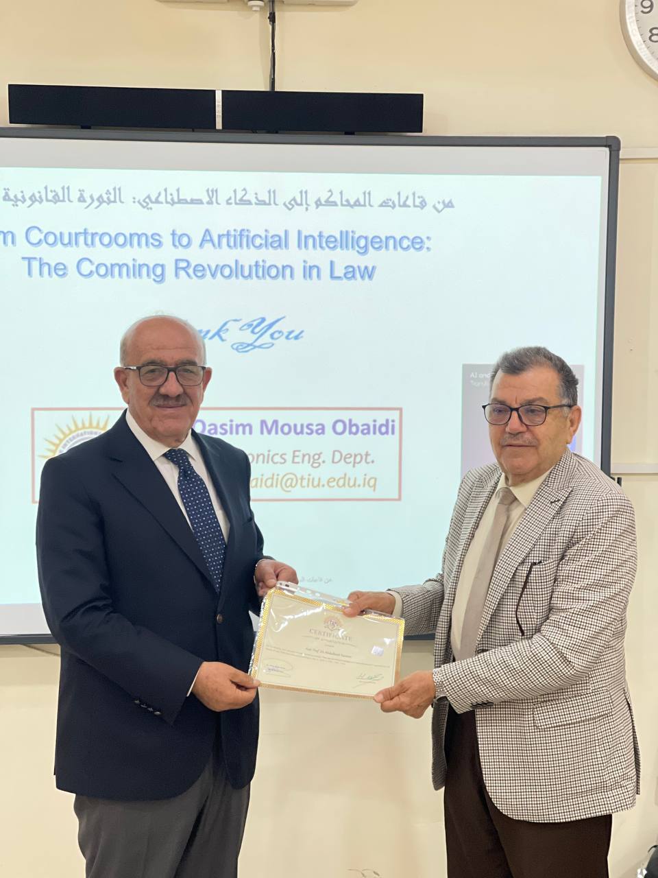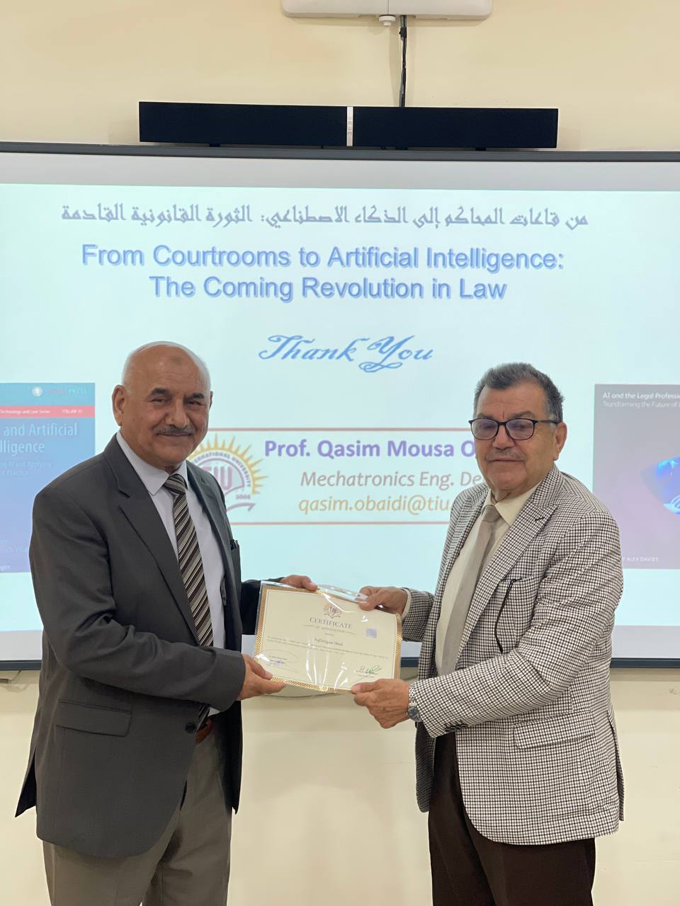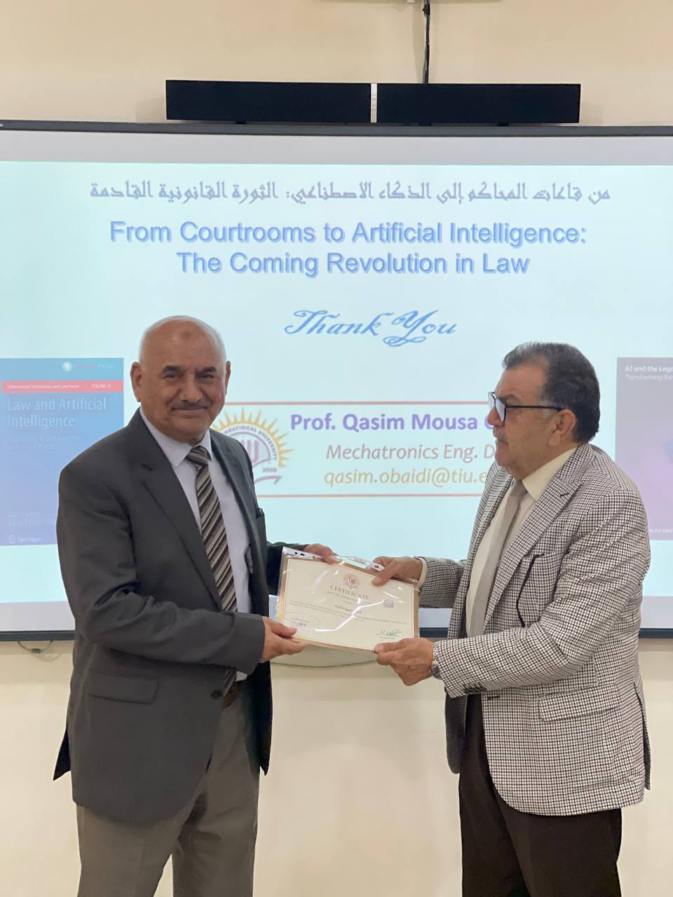 The workshop was moderated by Asst. Prof. Dr. Abdulbasit Kareem, a lecturer at the Faculty of Law. The first session, on “The role of artificial intelligence in law,” was presented by Prof. Dr. Qasim Obaidi, a lecturer at the Faculty of Engineering at TIU. The second session focused on “The role of artificial intelligence in judiciary.”