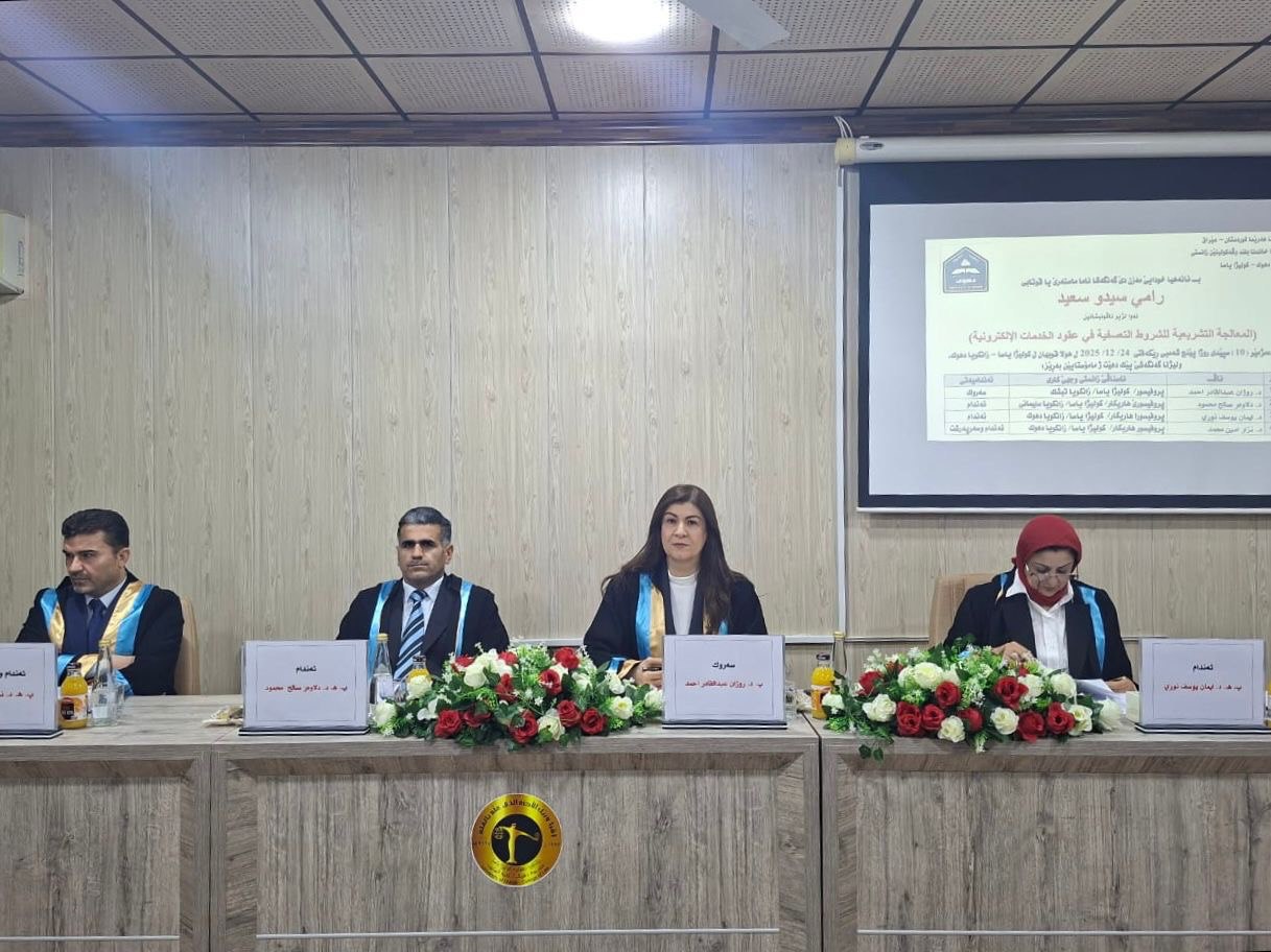 On 24 December 2025, Professor Dr. Rozhan Dzayee, Dean of the College of Law at Tishk International University, participated as Chair of the master’s thesis defense committee at the College of Law, University of Duhok. The thesis was submitted by the student Rami Seydo Saeed and was entitled “The Legislative Regulation of Unfair Terms in Electronic Service Contracts.”
