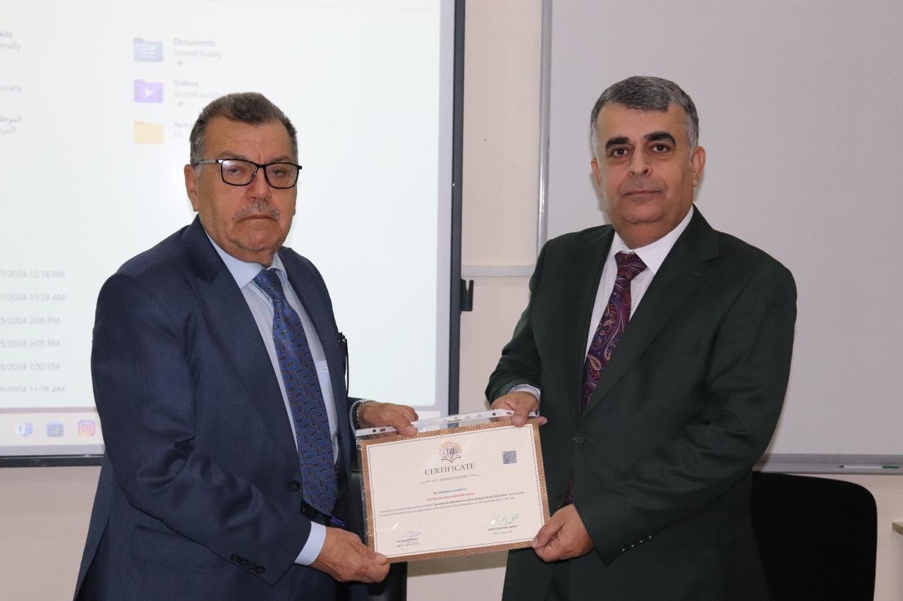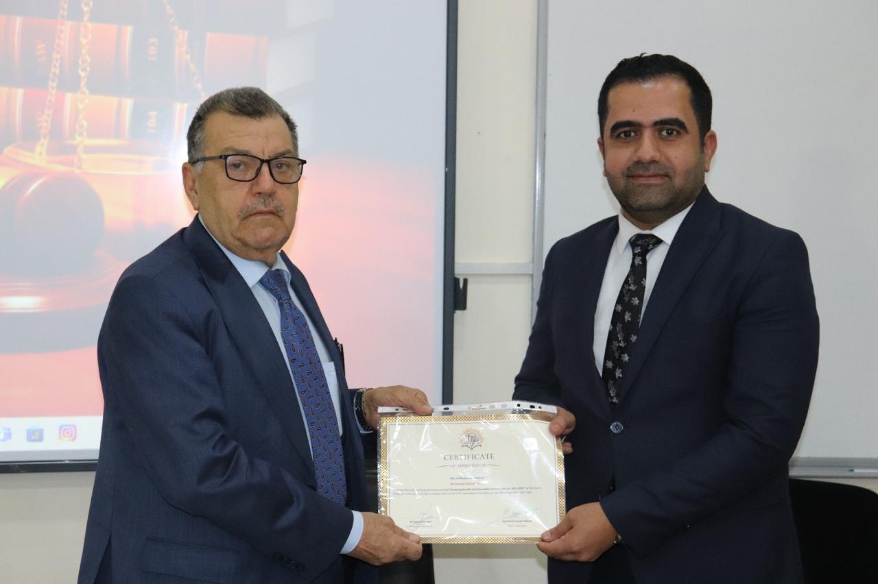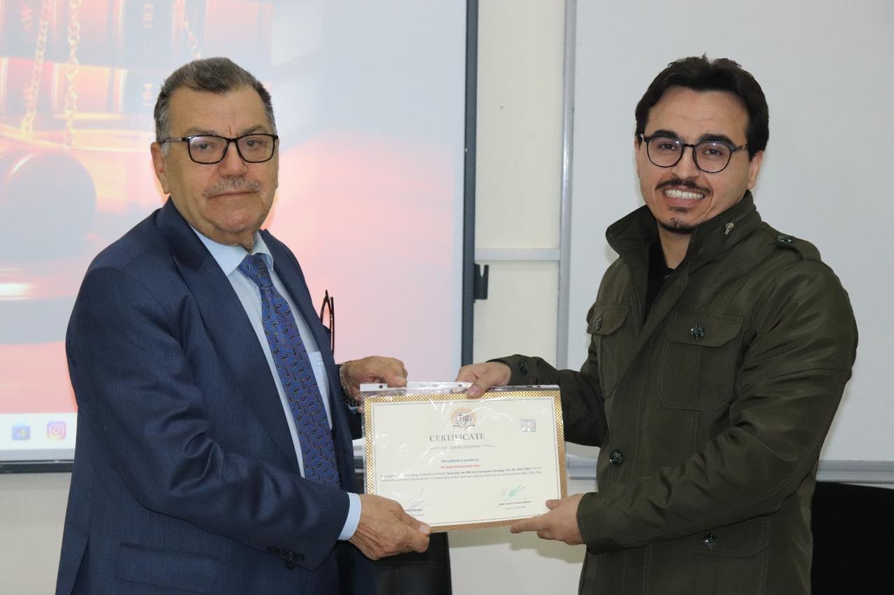Certificates of appreciation were issued to the speakers and moderator by Prof. Dr. Huseyin Mohammed Balisani, Dean of the Faculty of Law, and Dr. Mohammad Salih Mustafa, Head of the International Relations and Diplomacy Department.
