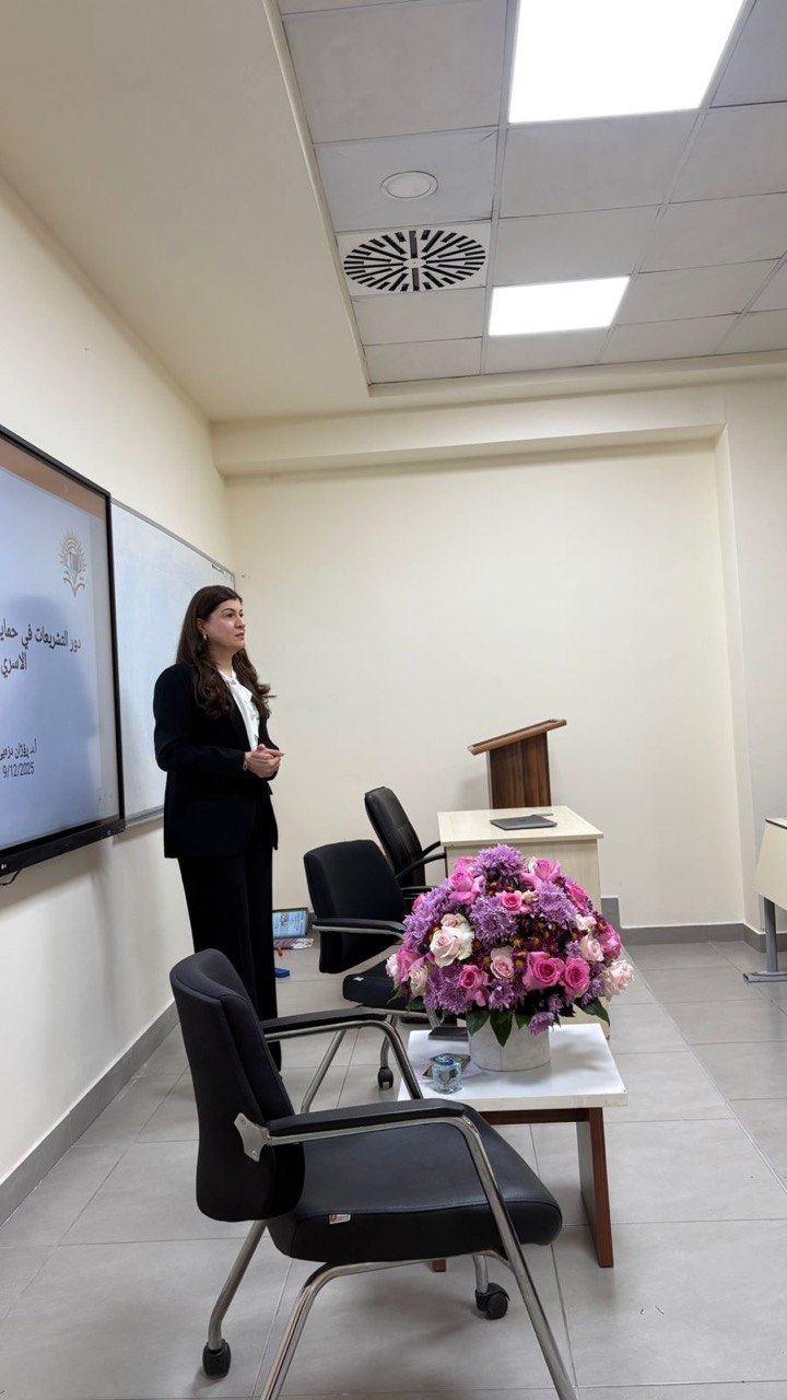 The workshop was delivered by Professor Dr. Rozhan Dzayee, Dean of the Faculty of Law, who addressed the legislative foundations for protecting women. The session was moderated by Ms. Zainab Yaseen Ahmed, a lecturer in the faculty of nursing.