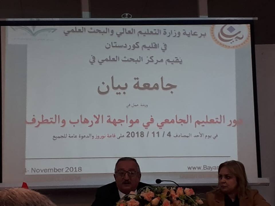 On November 4, 2018, Dean of the Faculty of Law (dr.Adnan Abdullah Rasheed) participated as the representative of the President of Tishk International University ( dr.Idris Hadi) at the University of Bayan’s workshop entitled “The Role of University Education in Countering Terrorist Thought and Extremism”