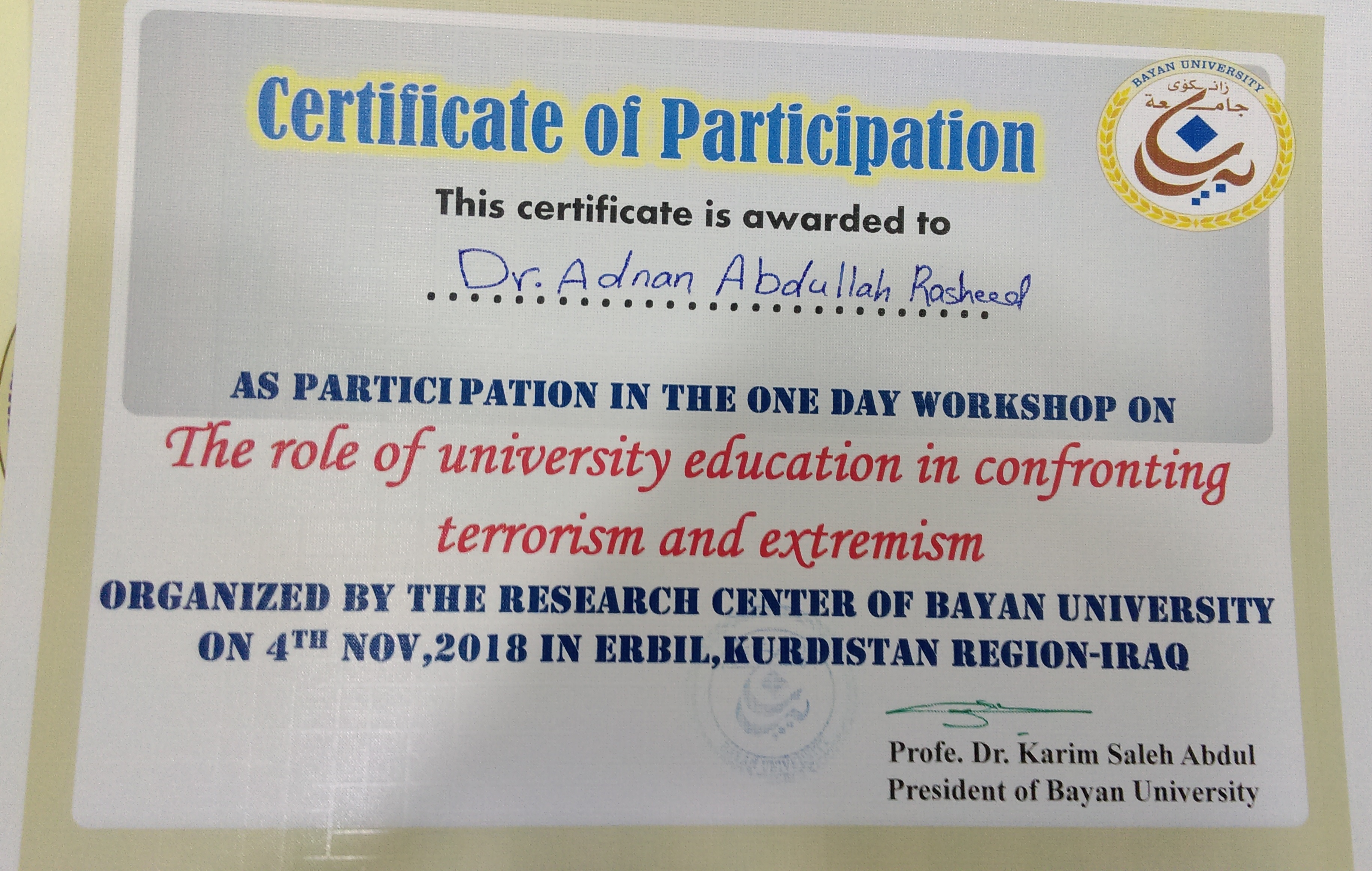 Where a group of lecturers presented topics on this issue with the participation of a large number of professors of the universities of Kurdistan in various colleges and at the end of the hip shop received (dr.Adnan Abdullah Rasheed) a certificate of participation of the President of Bayan University.