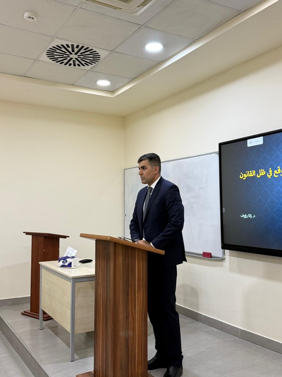 In continuation of Scientific activities the Law Faculty held a workshop on Thursday, October 23, 2025 entitled” Chaos Theory and Prediction Hypotheses Under the Law ” .the presenter was Professor Dr. Zana Raouf Hama Karim, a faculty member at the Faculty of Law at the University of Human Development in Sulaimani and a former member of the Kurdistan Regional Parliament, the workshop moderated by Mrs. Bayar Imad. during the workshop focused on the relationship between the elements of chaos theory and its impact on prediction hypotheses under legal systems, as well as the application of these elements within the framework of legal systems.